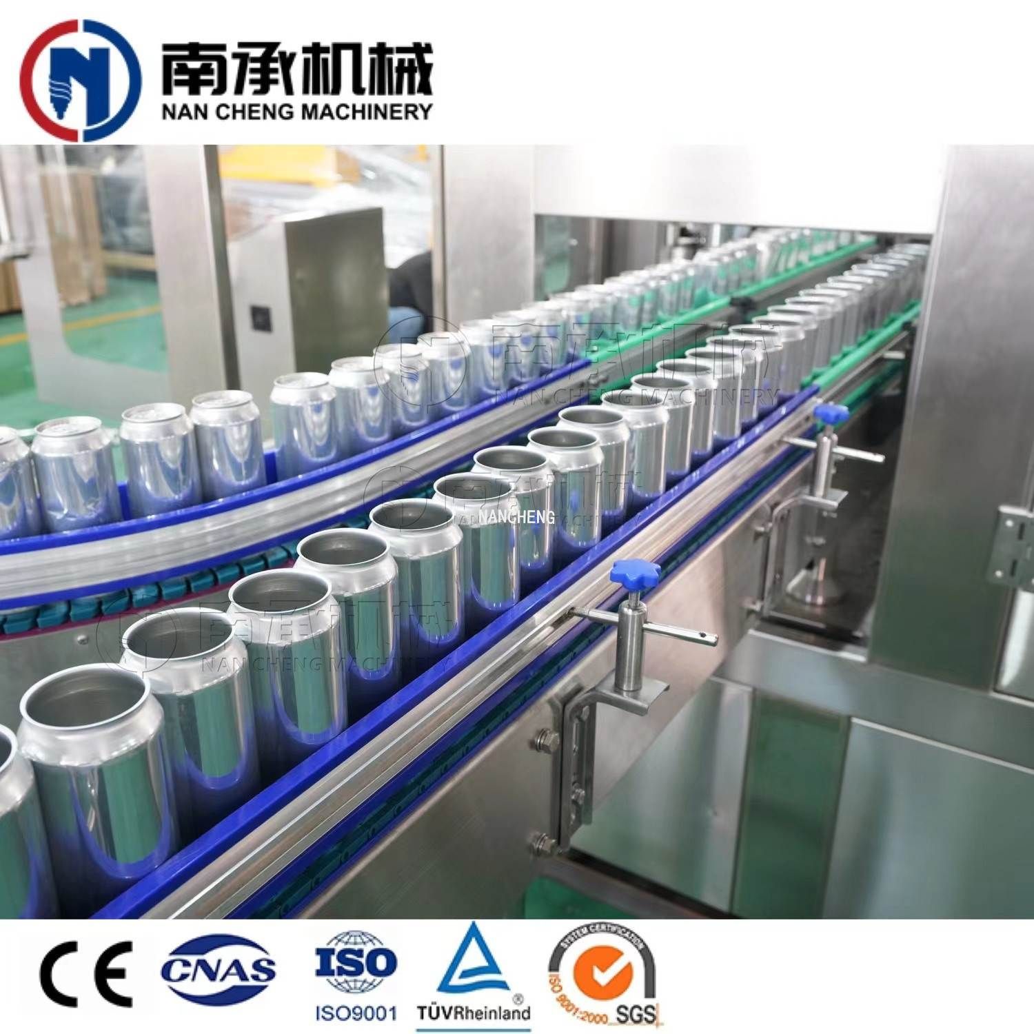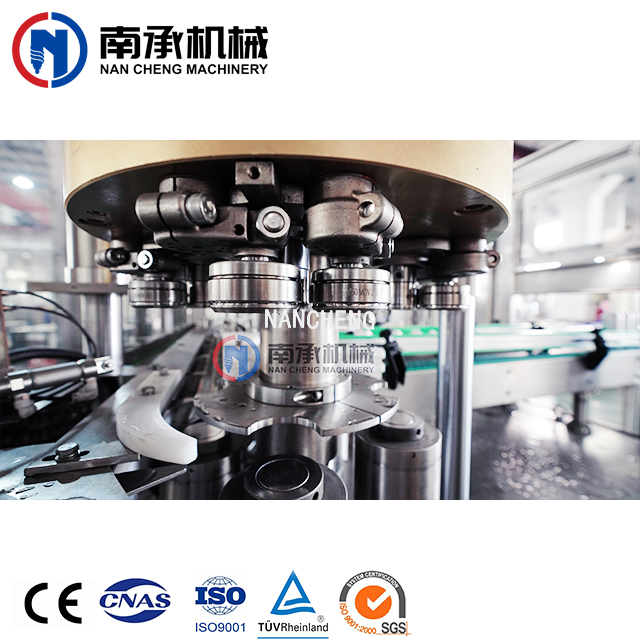 易拉罐灌裝機(jī)采用常壓灌裝原理,當(dāng)空罐經(jīng)撥輪進(jìn)入升降托罐盤(pán)后,灌裝閥和空罐對(duì)中,空罐升起并密封同時(shí)自動(dòng)打開(kāi)灌裝閥的閥口,當(dāng)灌裝液面堵住閥的回氣管口時(shí)停止灌裝。灌裝桶采用環(huán)形桶結(jié)構(gòu),減少了生產(chǎn)過(guò)程中的灌裝桶的重量,使易拉罐生產(chǎn)設(shè)備在旋轉(zhuǎn)過(guò)程中穩(wěn)定,料液通過(guò)管路系統(tǒng)從易拉罐灌裝機(jī)底部進(jìn)入灌裝桶內(nèi),可減少物料的沖擊,并能有效防止起泡,使灌裝精度高。